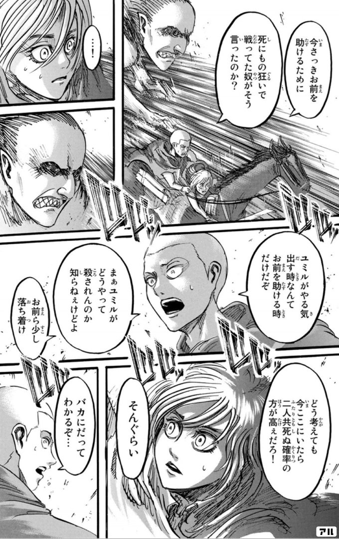 今さっき お前を助けるために 死にもの狂いで 闘ってた奴が そう言ったのか ユミルがやる気出すときなんて お前を助ける時だけだぞ まぁユミルが どうやって殺されんのか 知らねぇけどよ お前ら少し落ち着け どう考えても 今ここにいたら 二人共死ぬ確率の方が 高ぇ
